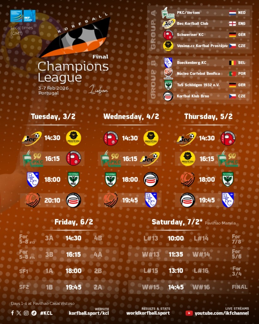 | Woensdag 4 februari | Núcleo Corfebol de Benfica - Boeckenberg KC | 19:45 |