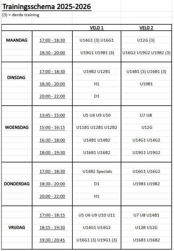 Hierna vinden jullie het trainingsschema vanaf 1 September 2025