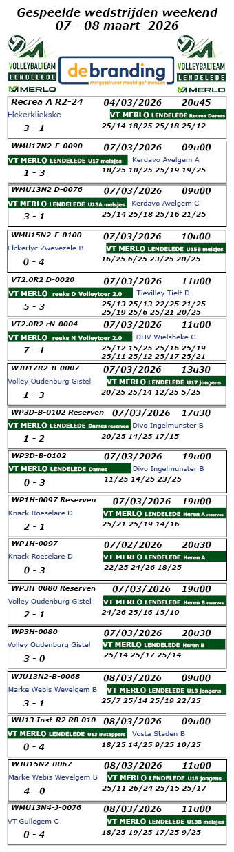 Hieronder de wedstrijduitslagen; wenst u de rangschikkingen te kennen, selecteer dan 'PLOEGEN' in de keuzebalk hierboven.