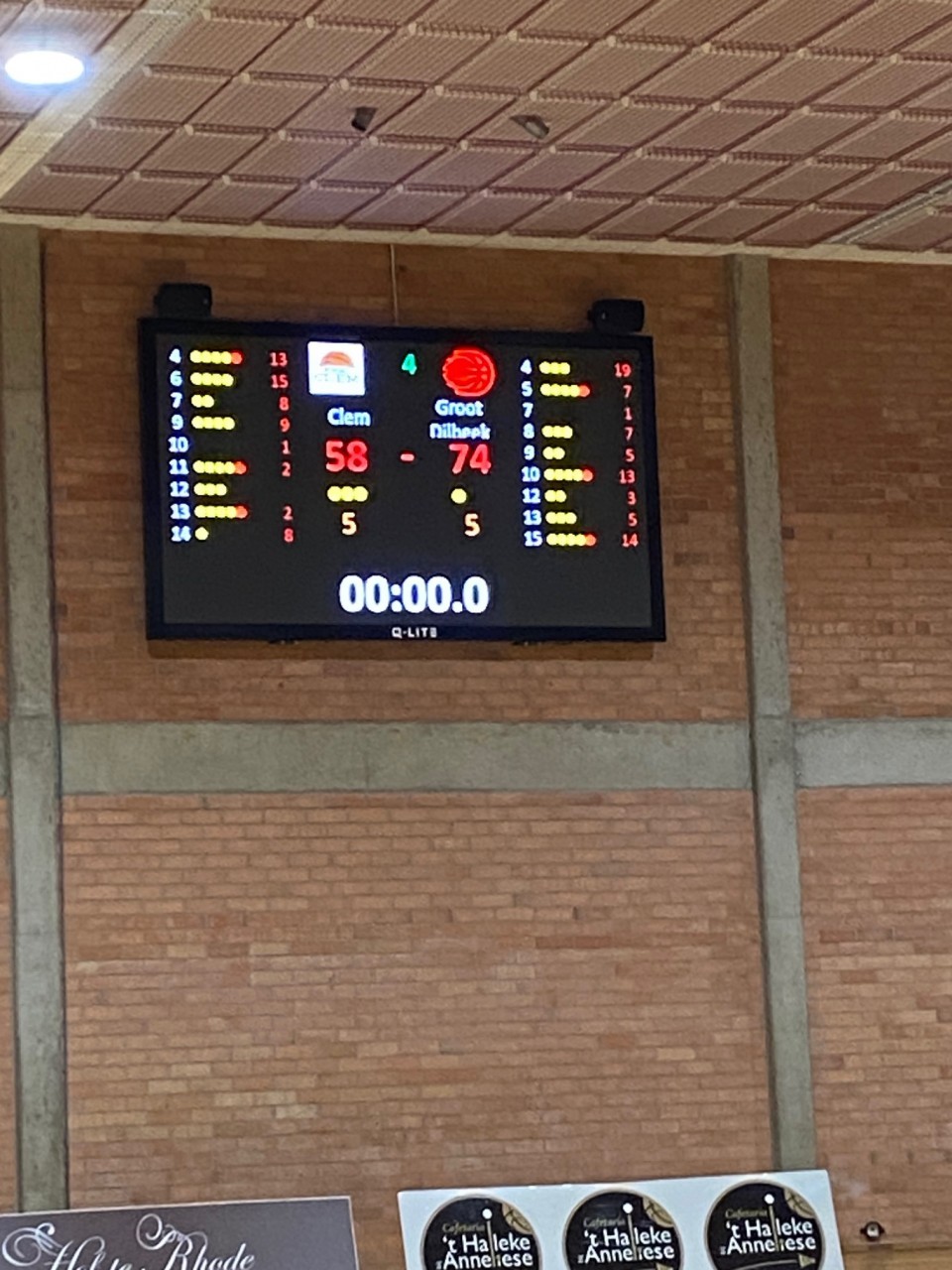 We waren 2 minuten ver in Q4 en Clem was tot 7 punten genaderd, 46-53. En via 49-55 werd het 52-55, het kon weer. Vervolgens werd het 52-59, terug een kloofje. De tijd begon te dringen, nog 4 minuten. Nog 3 minuten en het leek over, 52-62. De wedstrijd eindigde op 58-74.