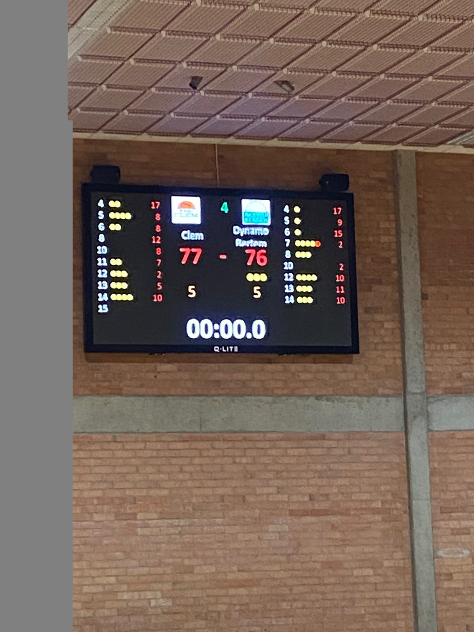 We waren 2 minuten ver, 59-61. Maar Clem geraakte niet verder, 63-67 na 4 minuten. En dan lukte het toch, 67-67 en vervolgens pakte Clem terug de voorsprong, 71-67. Kon Clem dit vasthouden? Nog 2 minuten. Nog één minuut, 74-69 op het bord. Nog 34 seconden, 74-71 op het bord. Spanning troef! Het werd 75-71, nog 17 seconden. Nog 7 seconden, 77-73 en op de buzzer nog een bom van de bezoekers, maar dat was niet voldoende. Eindstand 77-76 en Clem naar de 1/2 finale.