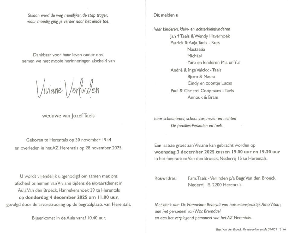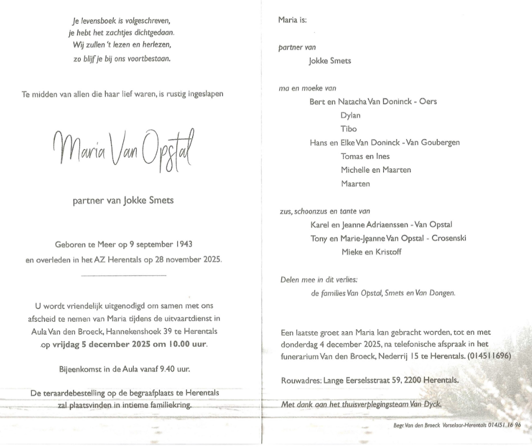 Met droefheid delen wij het bericht van het overlijden van Maria Van Opstal.
