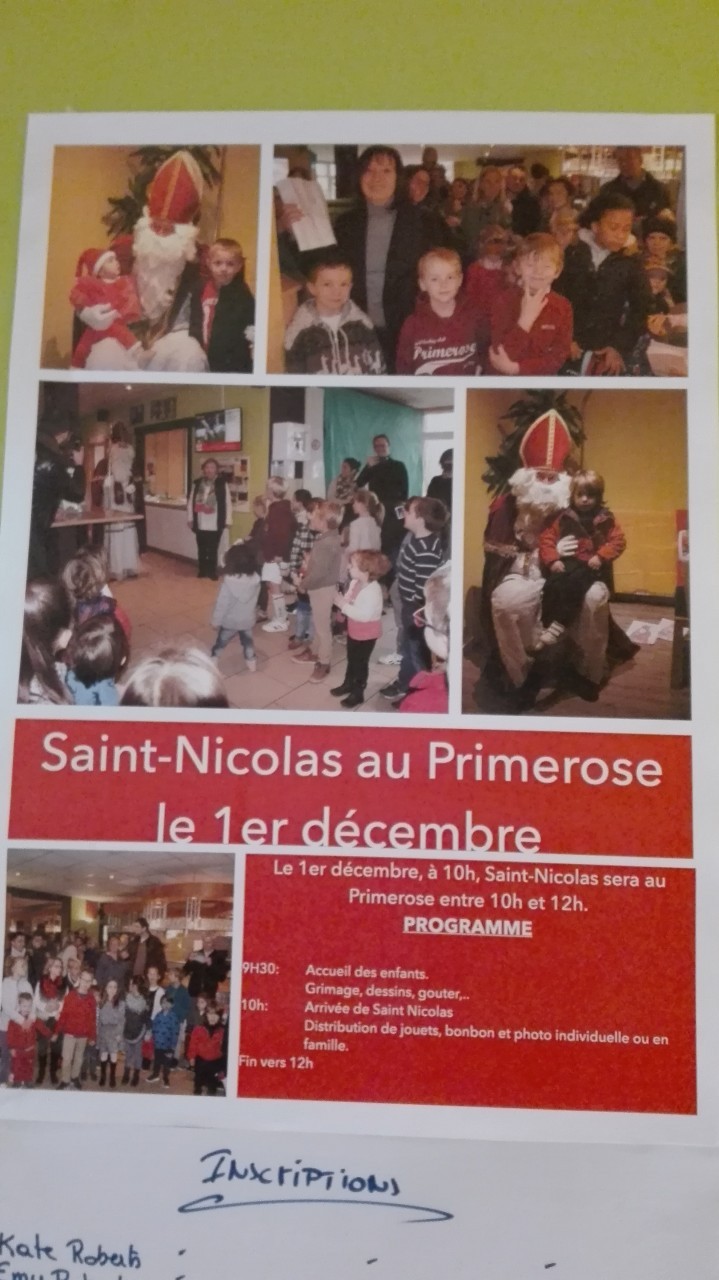 La venue de Saint Nicolas au Primerose est prévue pour ce 1 er décembre à 10h00 ! L'accueil des enfants est déjà prévu vers 09h30 (grimage, dessins,...) et le grand Saint arrivera vers 10h00 afin de distribuer de nombreux cadeaux à vos enfants sages (évidemment...).